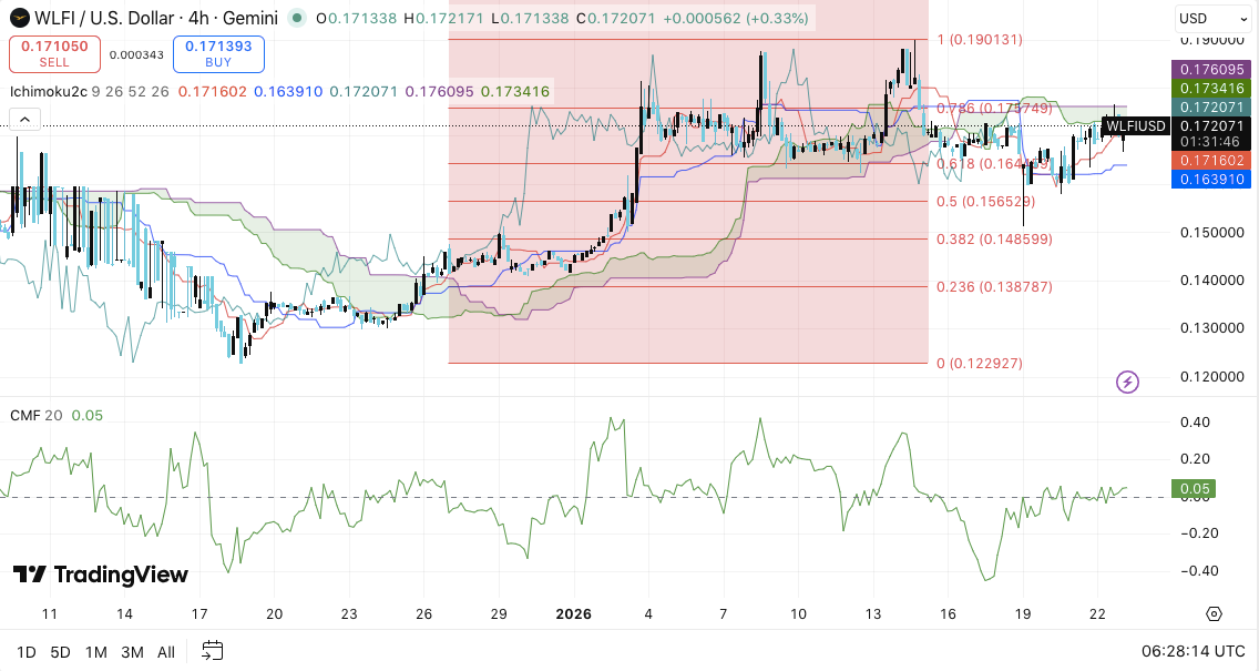World Liberty Financial (WLFI) traded near $0.1720 as buyers and sellers paused after a sharp rally. The token held above its 4-hour Ichimoku cloud, which often signals a supportive short-term trend.