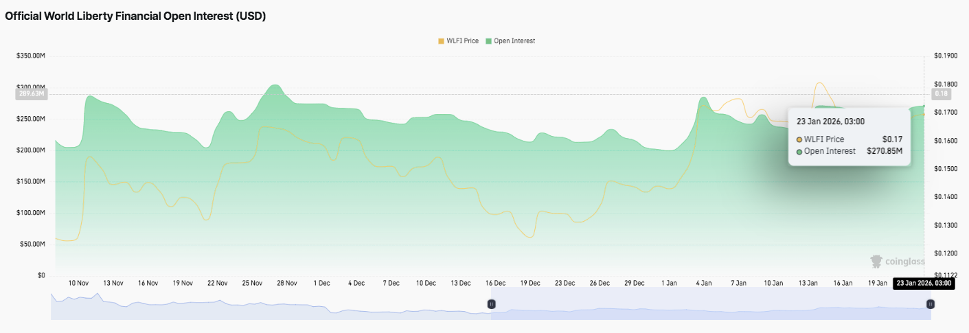 Early January brought another pickup, pushing open interest back toward $280 million. It has since stabilized near $270.85 million. Additionally, that level suggests traders still hold positions while awaiting direction.