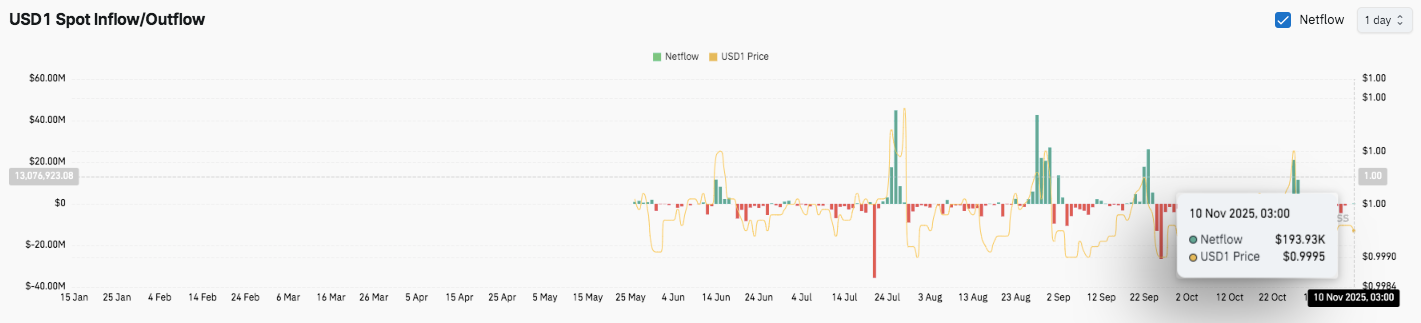 Meanwhile, USD1 stablecoin inflows and outflows show balanced capital rotation. Earlier inflow spikes exceeding $40 million between June and August have tapered to moderate levels. On November 10, net inflows stood at $193,930, with USD1 trading near $0.9995, suggesting stable liquidity conditions.