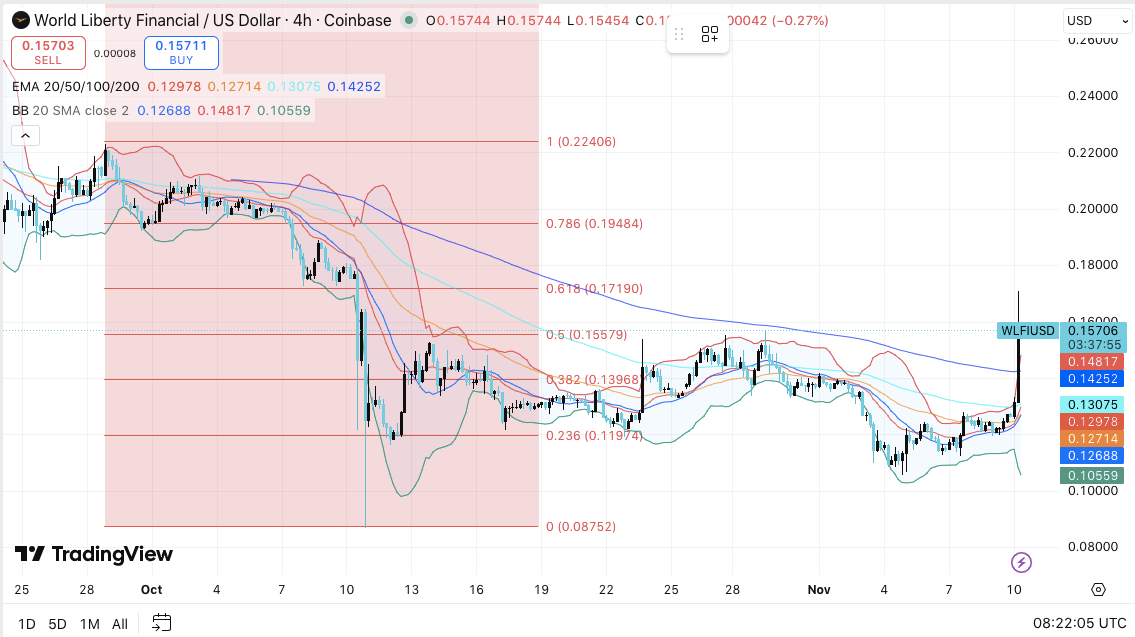 WLFI recently advanced to $0.157, surpassing the 0.382 Fibonacci retracement level at $0.1396 and briefly touching the 0.5 retracement at $0.1557. This marked the first major breakout since mid-October and positioned the token above its 20, 50, and 100 exponential moving averages (EMAs). The alignment of these averages around $0.1297, $0.1271, and $0.1307 reflects growing technical convergence a sign of trend transition.