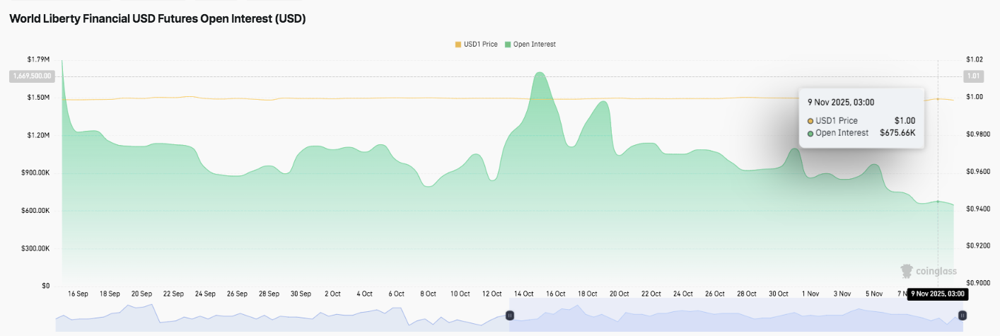 Beyond the spot market, open interest in WLFI futures has declined steadily from $1.67 million in September to around $675,000 by November 9. The trend underscores lower speculative activity and reduced leverage participation as traders await confirmation of direction.