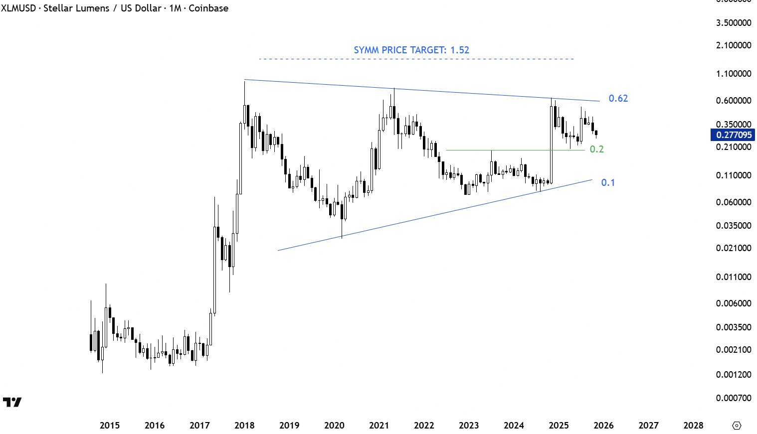 - Stellar’s XLM has been consolidating inside a seven-year symmetrical triangle.