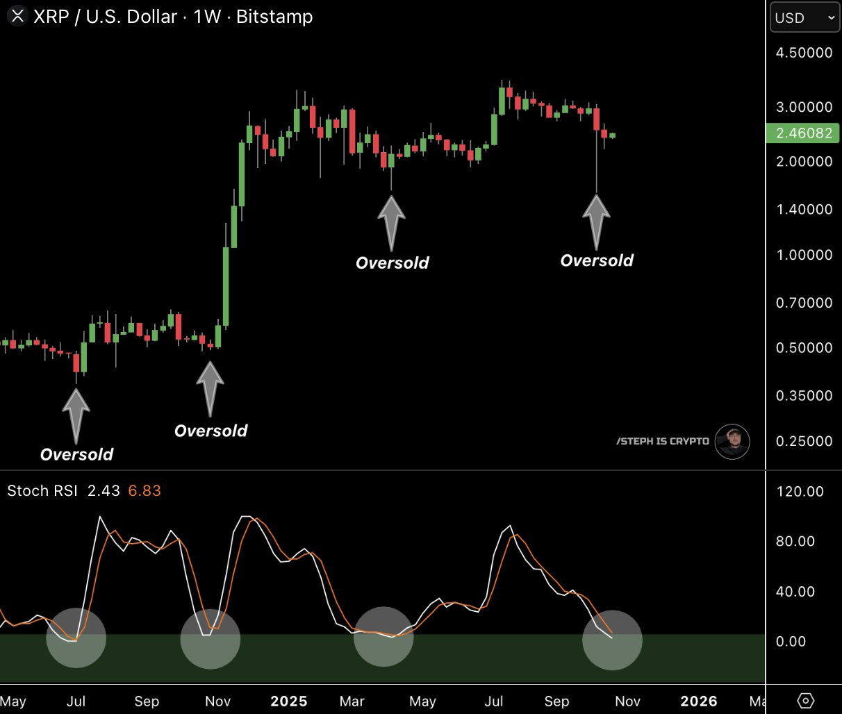 The XRP price is well-positioned to rebound in the near term after several indicators dropped to macro oversold levels. In the weekly timeframe, the XRP’s Stock RSI has dropped to the lowest level since March 2025, thus signaling an imminent rebound ahead.