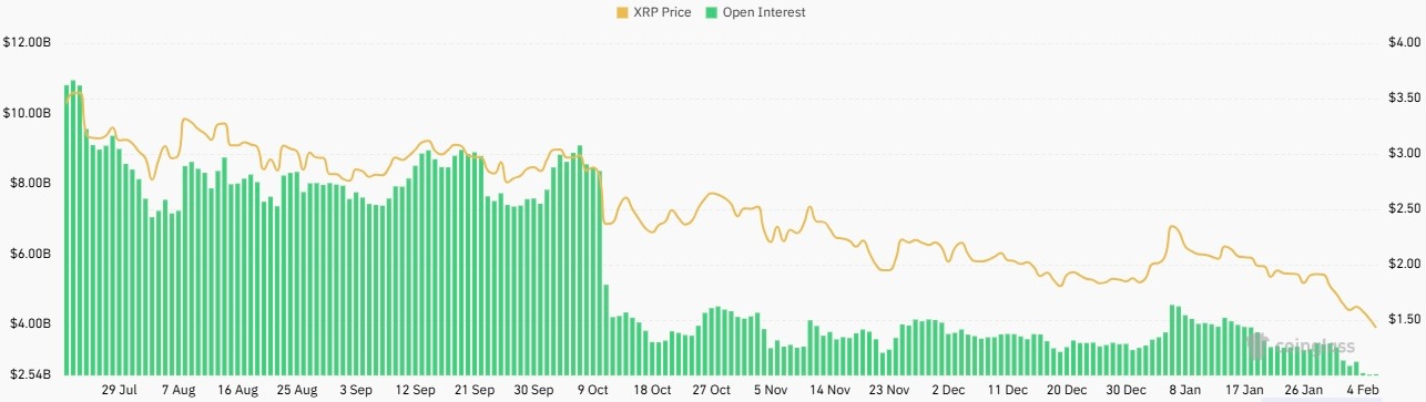 The main reason the XRP price has been in a free fall over the past few weeks is the broader liquidity crunch in the crypto market. According to CoinGlass market data, XRP Open Interest has dropped from over $9 billion in October 2025 to about $2.5 billion at press time.