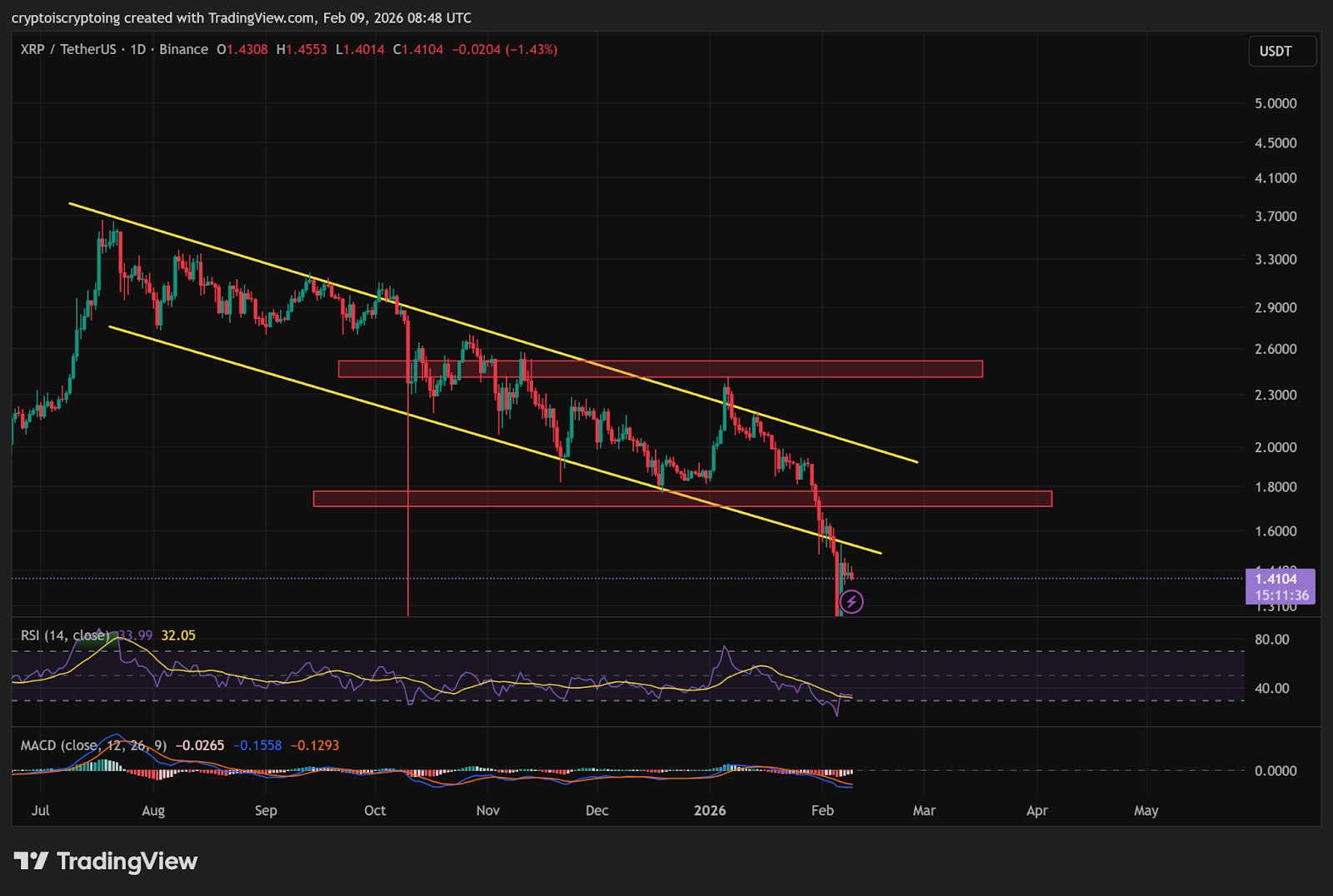 Meanwhile, RSI is near oversold territory while the MACD remains negative. A successful hold above the $1.35-$1.40 support zone could trigger a relief bounce.