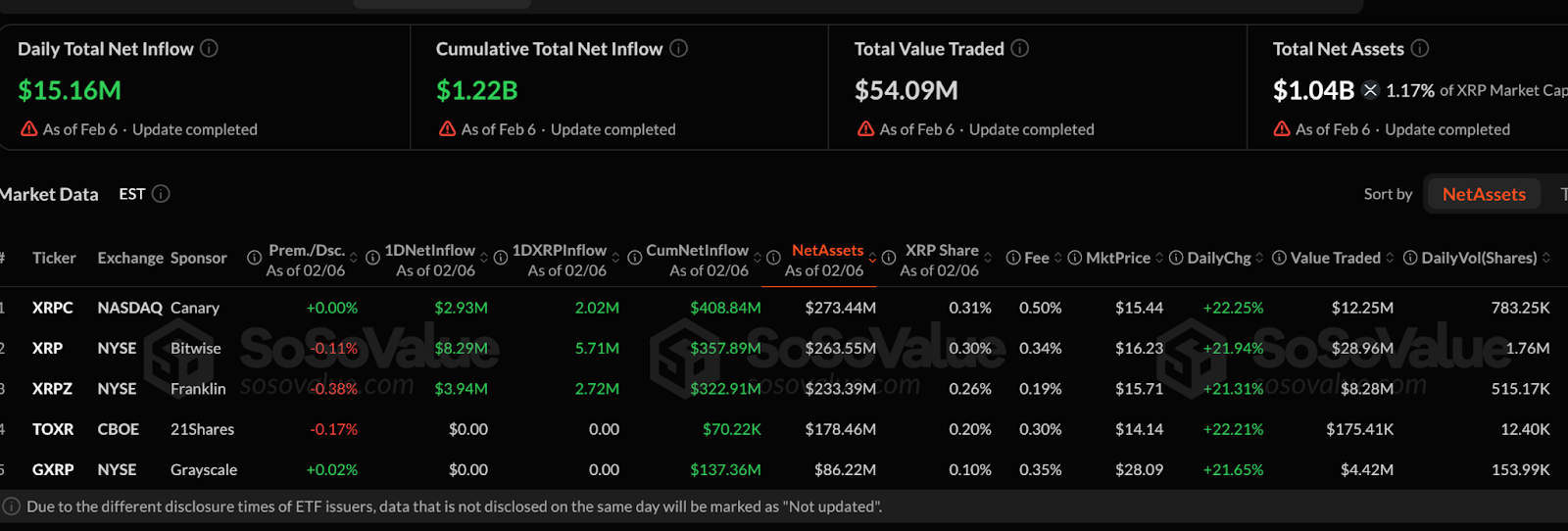 - Total XRP ETF assets now stand at $1.04 billion, or about 1.17% of XRP’s market cap.