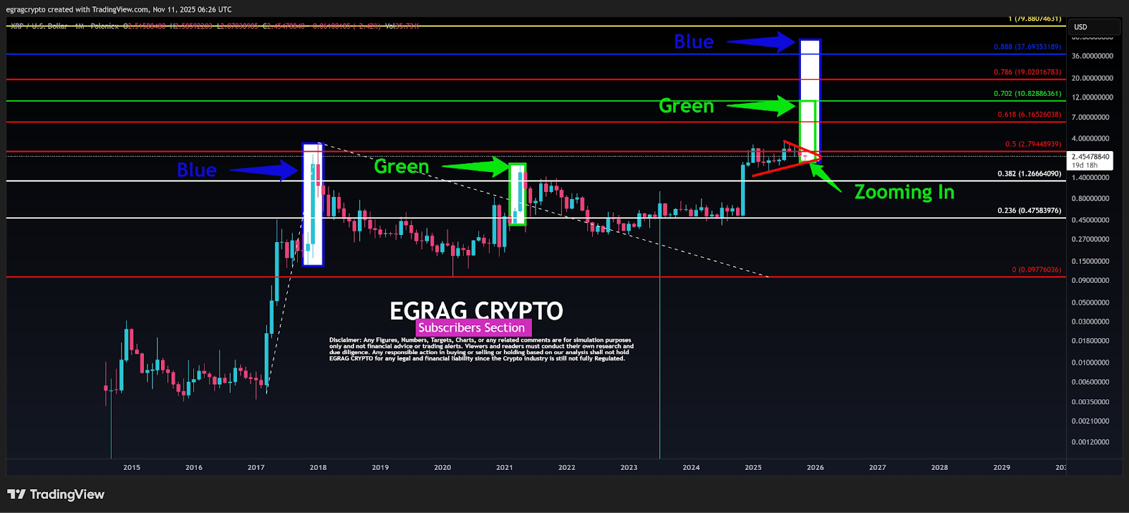 EGRAG’s chart highlights two past phases: the 2017 Blue Candle and the 2021 Green Candle, when XRP moved sideways for months before shooting up sharply. Both breakouts followed long periods of tight consolidation, similar to the red triangle XRP is trading in now.