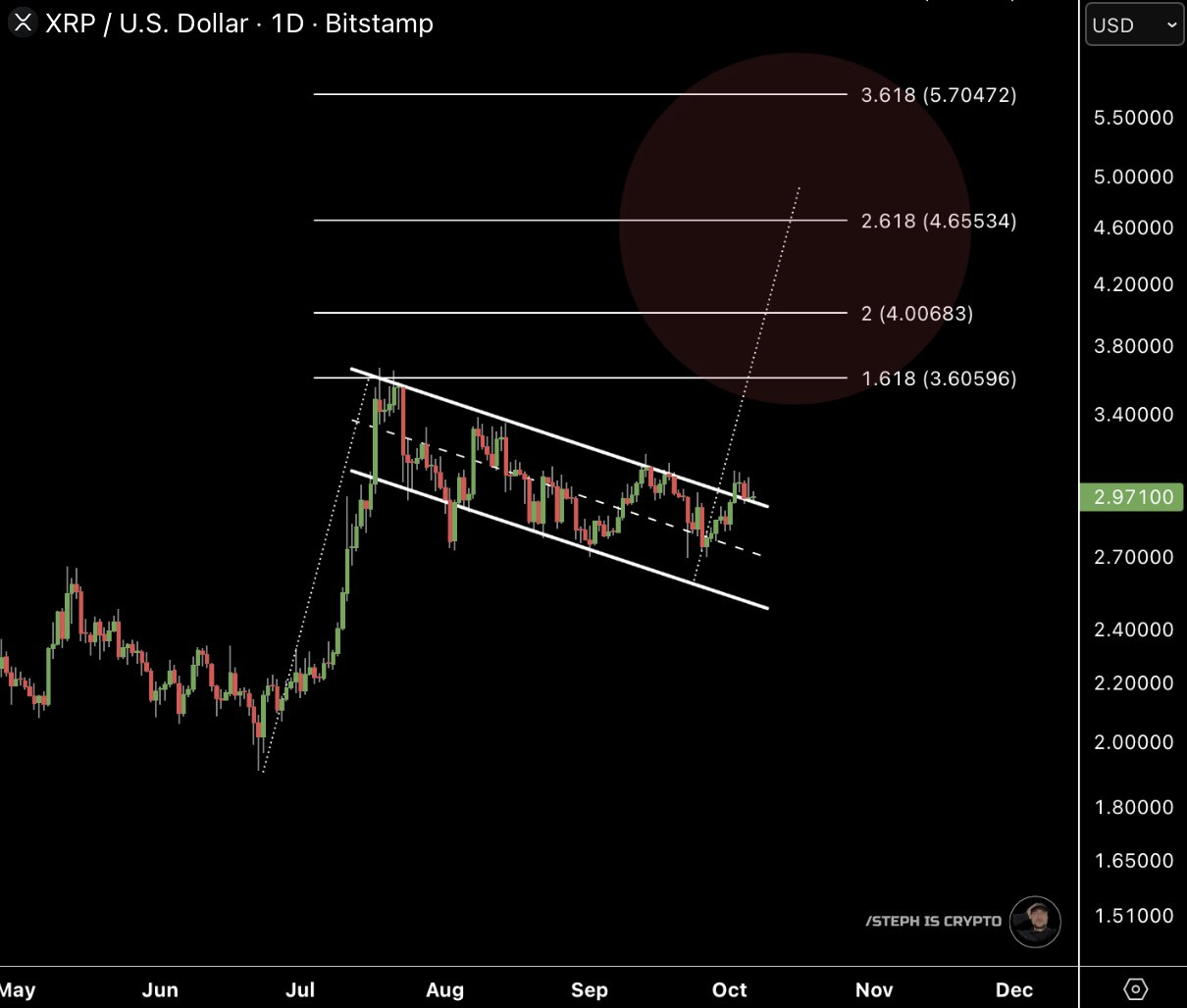 Steph is Crypto noted that XRP is testing the upper edge of a descending channel that has contained price since mid-year, suggesting bullish continuation above $2.70. The analysis outlines Fibonacci extensions at $3.60, $4.00, and $4.65, with an upper projection near $5.70 marking the potential October target zone.