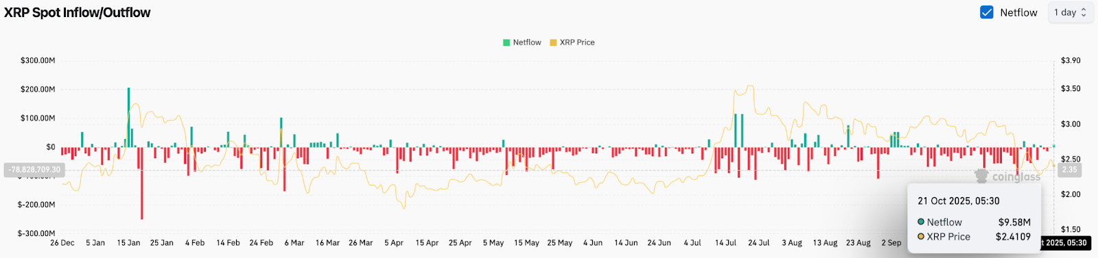 On-chain flows reflect subdued confidence. According to Coinglass data, XRP spot netflows showed a modest $9.58 million inflow on October 21, yet this comes after weeks of consistent outflows.