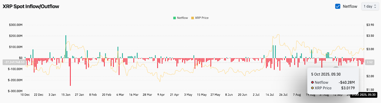 On-chain data paints a more cautious picture. Coinglass data recorded $40.2 million in net outflows on October 5, extending the six-day total to approximately $300 million in cumulative withdrawals. Persistent outflows often indicate profit-taking or capital rotation toward other large-cap assets such as Ethereum or Solana.