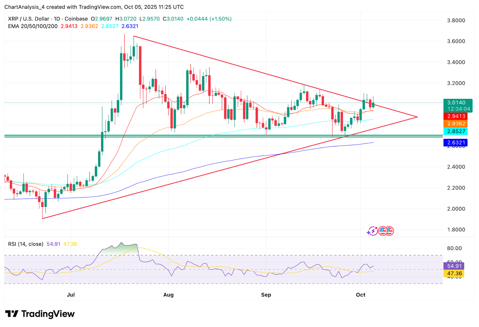 The daily chart shows XRP price pressing against converging trendlines that form a symmetrical triangle, with support anchored near $2.94 and resistance around $3.10. The 20-day EMA has aligned at $2.94 while the 50-day EMA at $2.93 provides additional structural backing.
