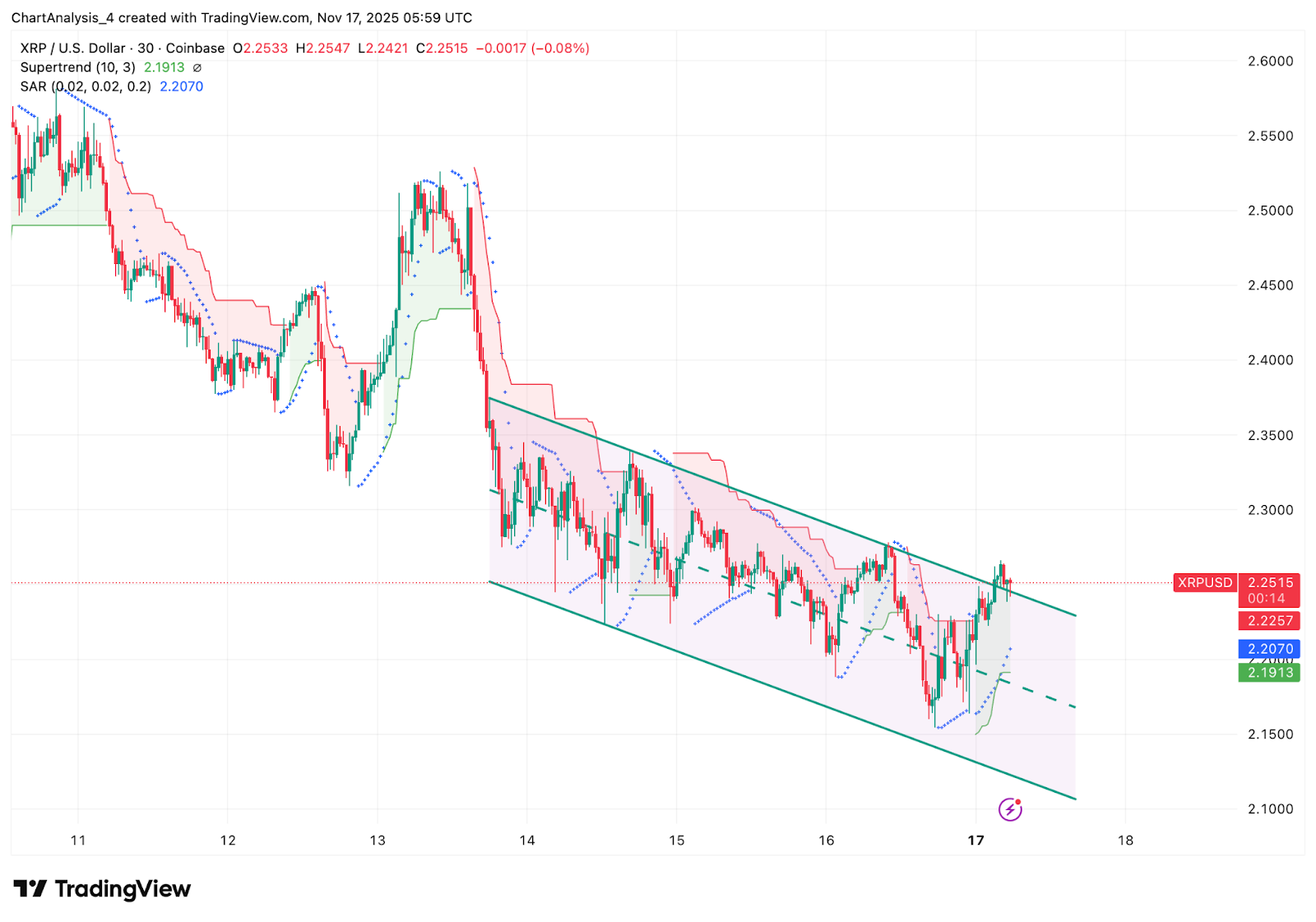 On the 30-minute chart, XRP trades inside a clean downward channel. Price has tested the upper boundary twice but failed to break out. Supertrend remains red, and the Parabolic SAR prints above price on most swings, confirming intraday selling pressure.