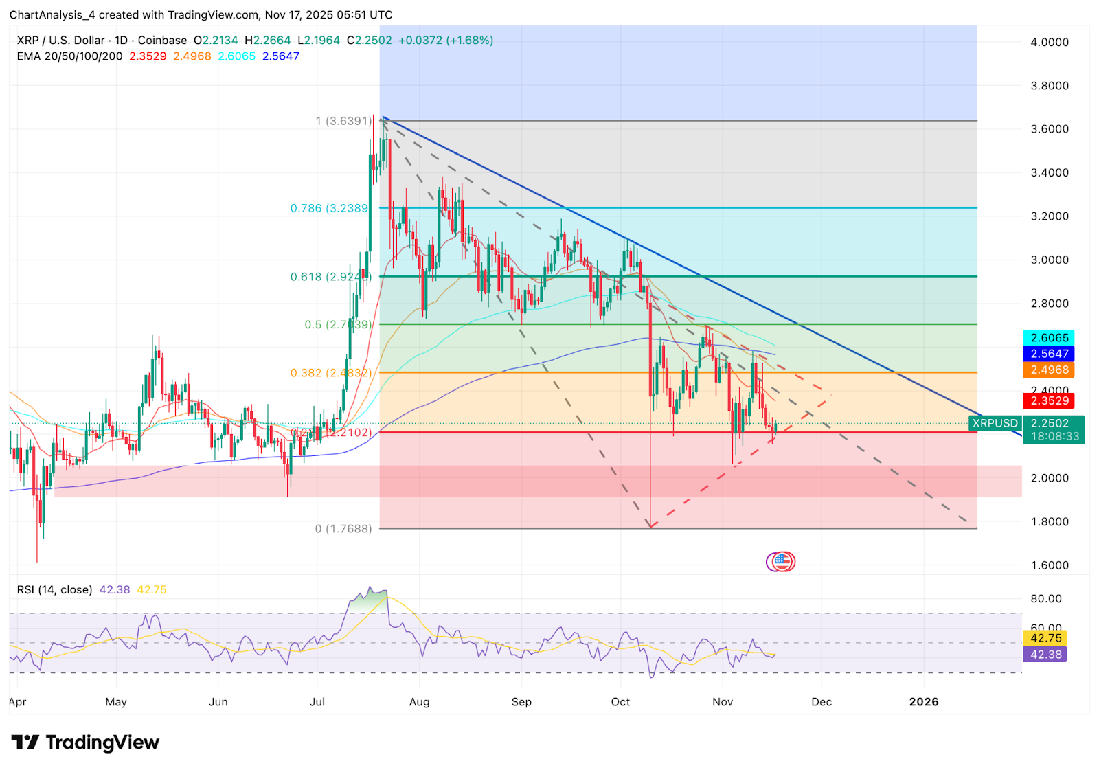 - XRP trades near $2.25, holding $2.20 support as sellers defend the descending trendline for a third straight session.