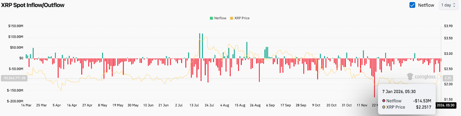 Spot flow data continues to lean defensive. XRP recorded a $14.5 million net outflow on January 7, extending a pattern of capital leaving exchanges during rallies rather than accumulating during dips.