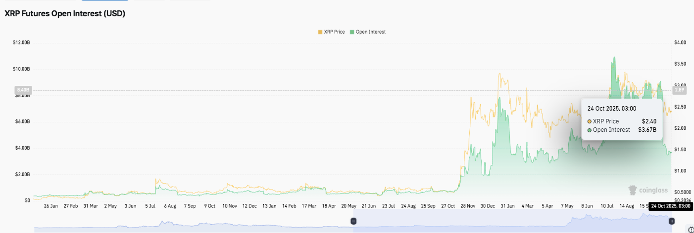 XRP futures open interest has shown notable expansion in 2025, rising from around $1 billion in mid-2024 to more than $3.6 billion by late October. This increase highlights growing speculative activity and leveraged positioning among traders.