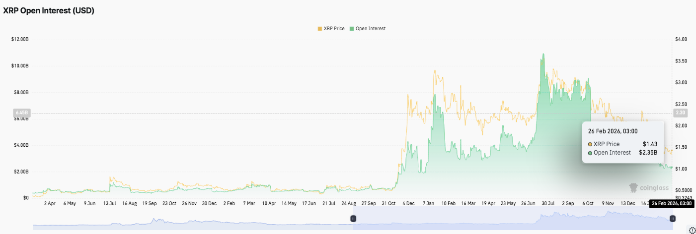 Open interest data adds another layer to the story. Earlier this cycle, leveraged positioning surged above $10 billion as price approached multi-month highs. Since then, open interest has declined toward $2.35 billion. Additionally, that contraction signals reduced speculative appetite and cooling momentum.