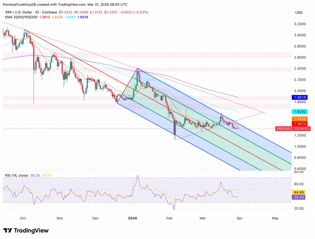 XRP peaked near $3.40 in January and has been sliding inside a descending channel since. Price sits in the lower third of the channel at $1.32, with all four EMAs declining overhead: the 20-day at $1.3813, the 50-day at $1.4526, the 100-day at $1.6242, and the 200-day at $1.8818. The channel’s lower boundary approaches $1.20 to $1.25 by mid-April if the slope holds.