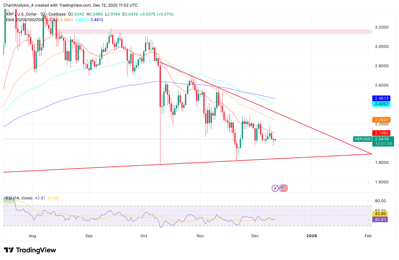 Bearish case: Failure to hold $2.00 exposes $1.85, with a deeper pullback toward $1.75 if the rising trendline breaks. A rejection at the descending trendline keeps XRP locked in consolidation and delays any recovery attempt.