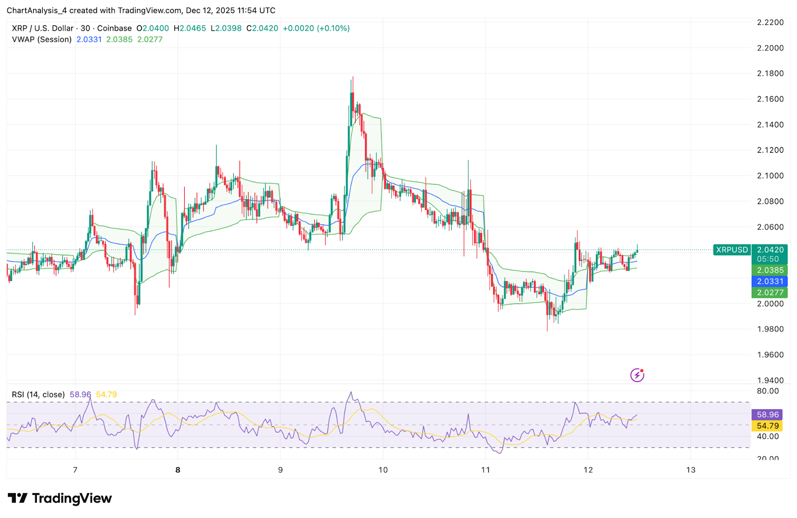 On the 30-minute chart, XRP is consolidating near the VWAP zone around $2.03–$2.04. Short-term price action shows higher lows forming after the recent dip, but momentum remains controlled rather than impulsive.