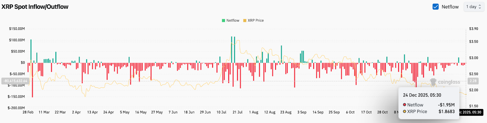 Flow data reinforces the technical picture. XRP spot netflows remain negative, signaling ongoing distribution rather than accumulation. On December 24, netflows showed an additional $1.95 million in outflows, extending a pattern that has persisted for most of the quarter.