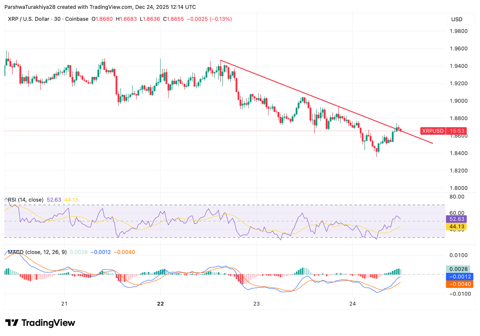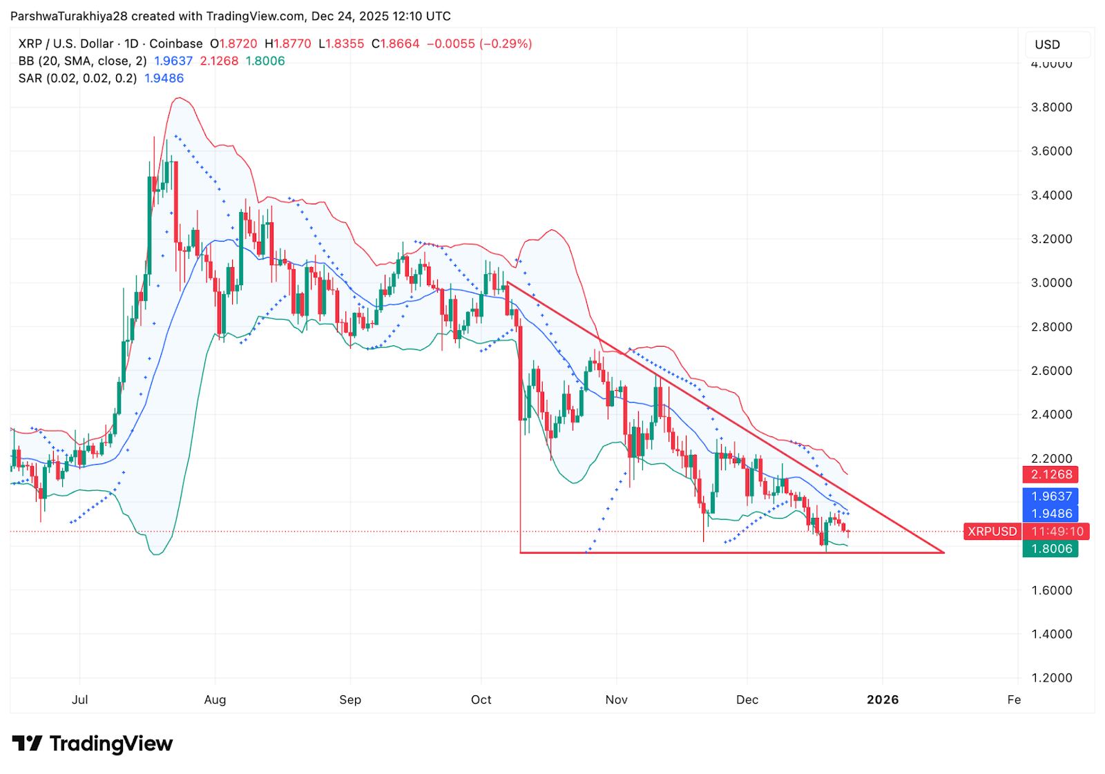 XRP price today trades near $1.86, sitting just above a critical demand zone as sellers continue to defend a long-term descending trendline. The market remains compressed after weeks of lower highs, with price repeatedly failing to reclaim key resistance levels. While downside momentum has slowed, structure still favors sellers heading into December 25.