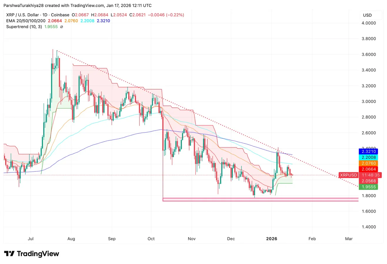 - XRP consolidates at $2.06, trapped between the 20/50 EMA cluster and descending triangle resistance as momentum stalls.