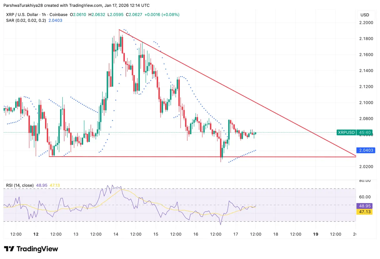 XRP price today trades near $2.06 as a descending triangle pattern compresses price action into a tightening range. The setup places buyers at a critical decision point, with triangle support at $2.04 holding while overhead resistance continues to fall.