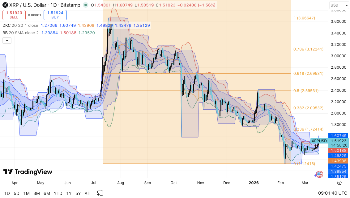 - XRP consolidation near $1.50 tests support amid a persistent downtrend and bearish pressure.