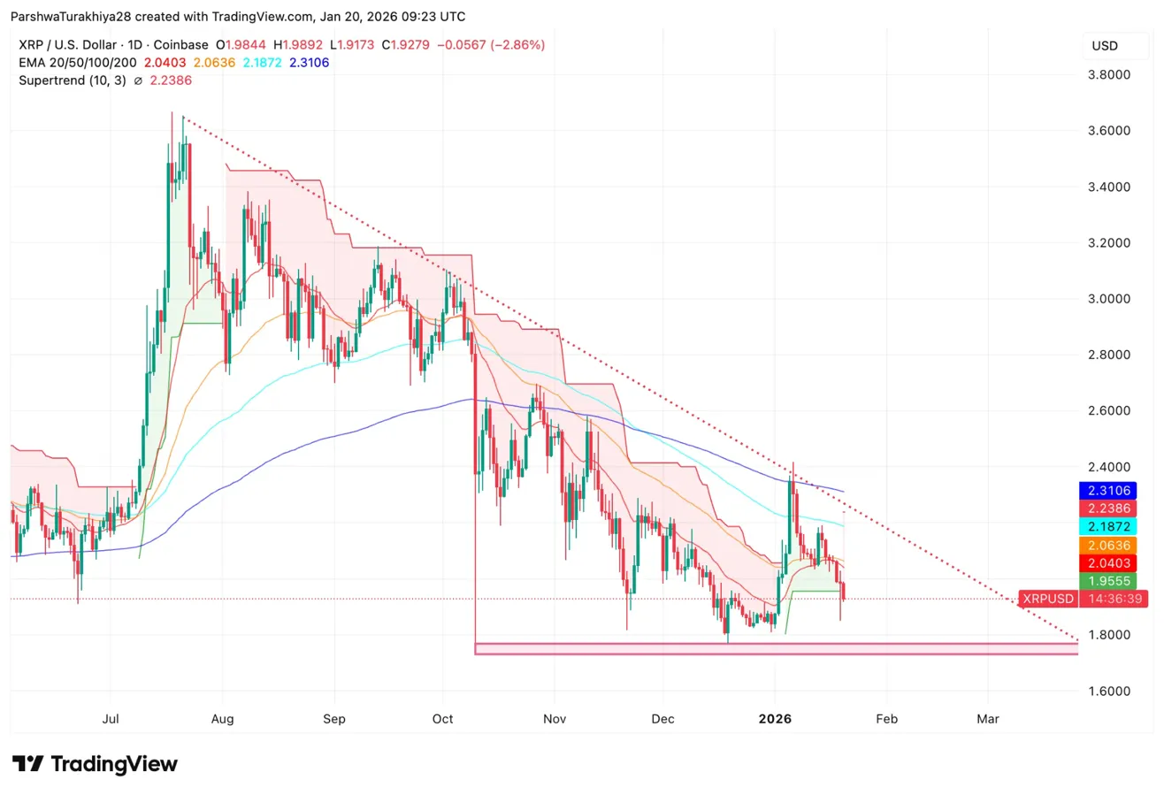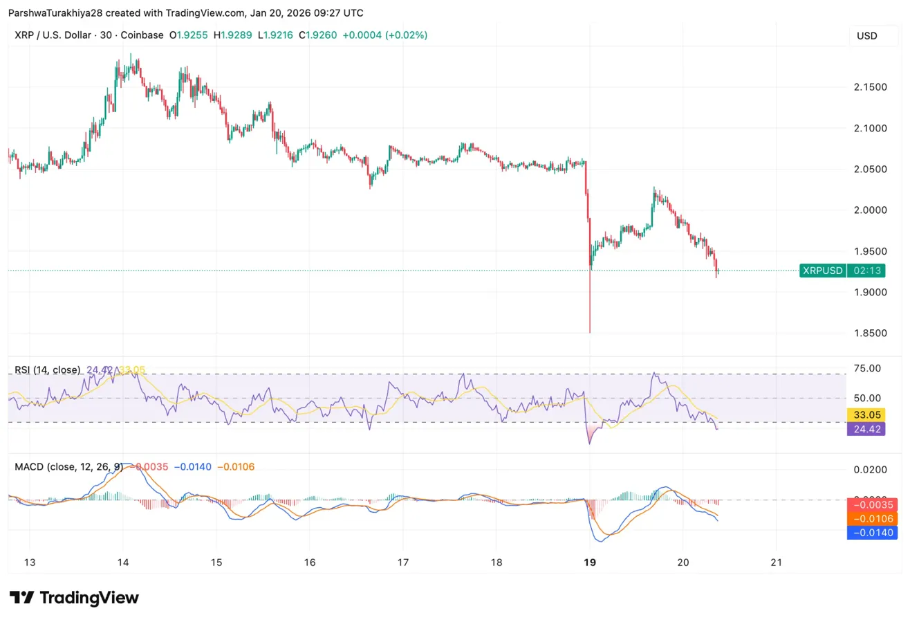 - XRP drops 2.86% to $1.9279, breaking the $2 psychological support that has anchored price action since December.