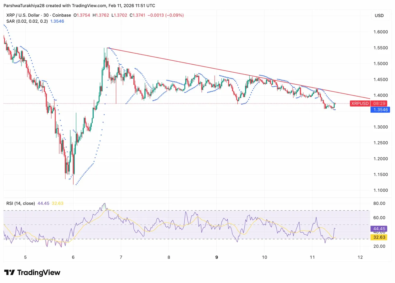The 30-minute chart reveals XRP testing support near $1.3702 after breaking below the descending trendline. Parabolic SAR dots sit above price at $1.3546, confirming bearish momentum. RSI holds at 44.45, neutral but declining as sellers defend each bounce attempt.