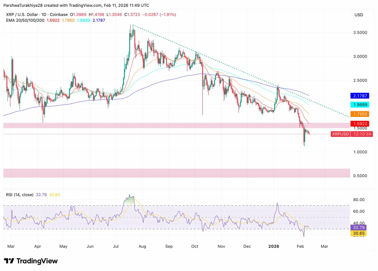On the daily chart, XRP has broken below every major moving average. The 20-day EMA sits at $1.5922, the 50-day at $1.7950, the 100-day at $1.9889, and the 200-day at $2.1787. All four EMAs are stacked downward, creating a clear resistance ceiling.