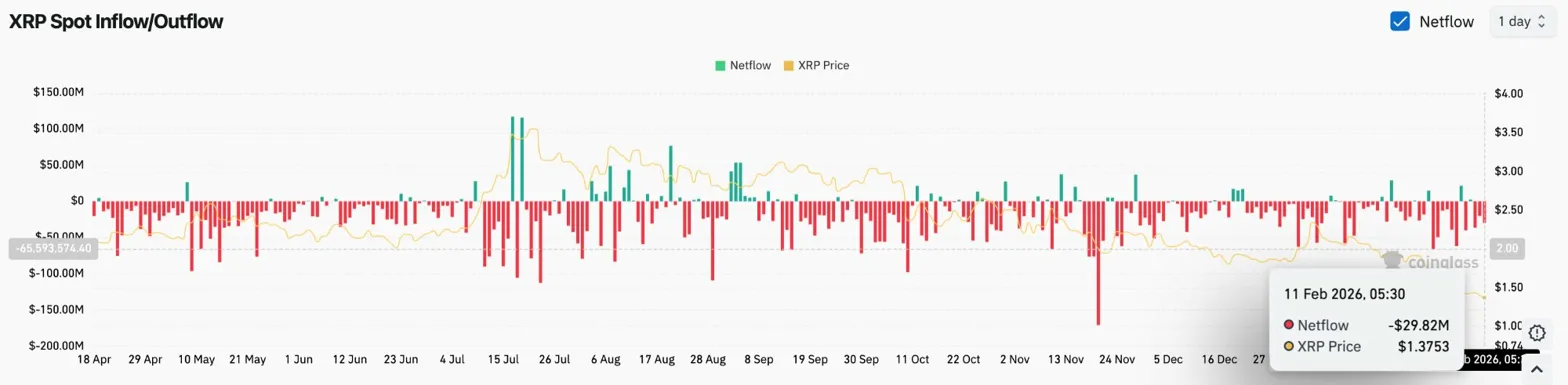 Spot flows tell a different story. Coinglass data shows XRP recorded $29.82 million in net outflows on February 11, one of the largest single-session exits in recent weeks.