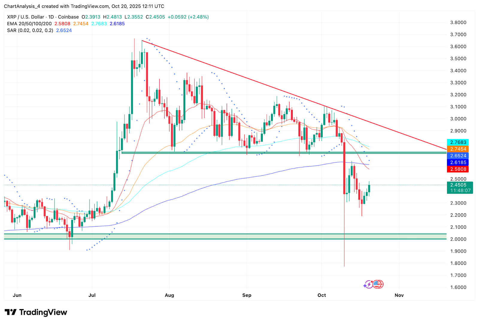 XRP price today trades near $2.45, recovering modestly after last week’s sharp selloff. Buyers are attempting to stabilize above the $2.35–$2.40 zone, but resistance remains heavy around the EMA cluster near $2.62–$2.76. With ETF delays weighing on sentiment and new security concerns rattling the community, traders are watching if XRP can avoid another drop toward $2.20.