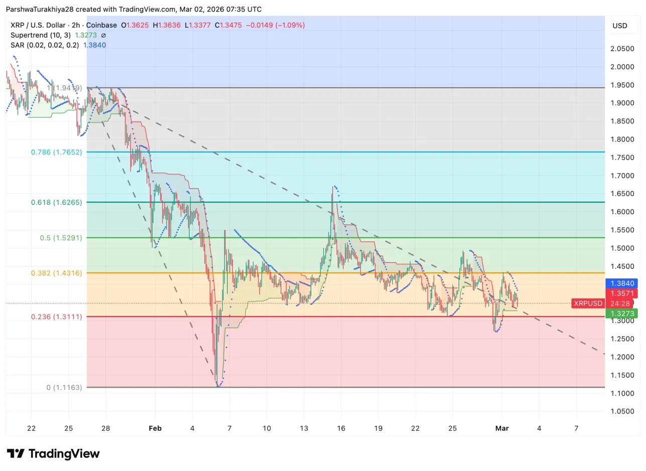 The 2-hour chart shows XRP testing the 0.382 Fibonacci retracement level at $1.4316 (orange zone). The Supertrend at $1.3273 provides immediate support, while the Parabolic SAR at $1.3840 acts as resistance above current price.