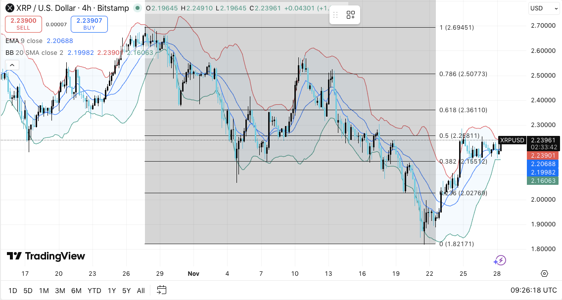 Resistance sits at $2.28 and $2.29, where XRP struggles to break higher. A move above this range opens space toward $2.36. That level aligns with the 0.618 Fibonacci zone and marks a decisive hurdle.