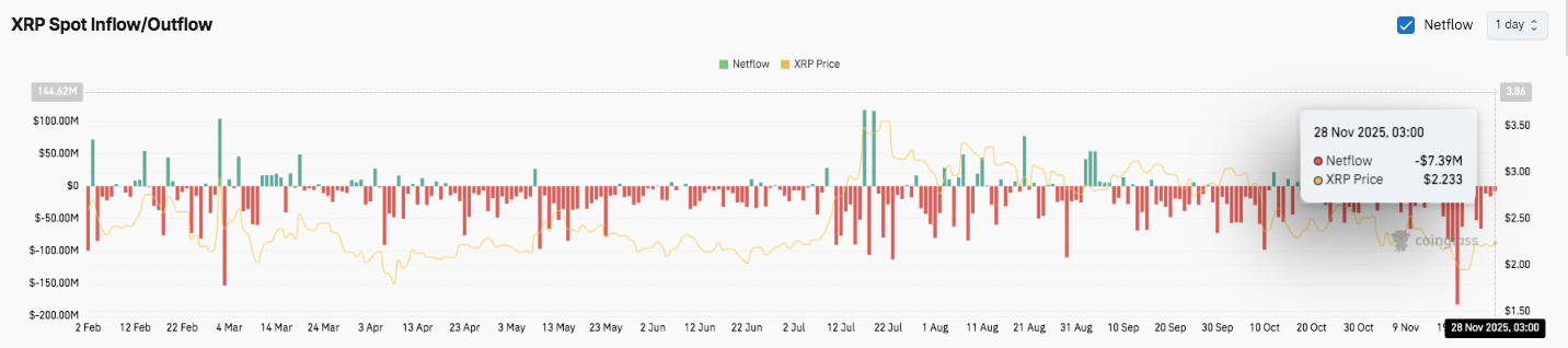 Exchange flows show consistent outflows through late November. Most sessions record withdrawals between $50 million and $150 million. This behavior signals cautious positioning as traders reduce exposure.