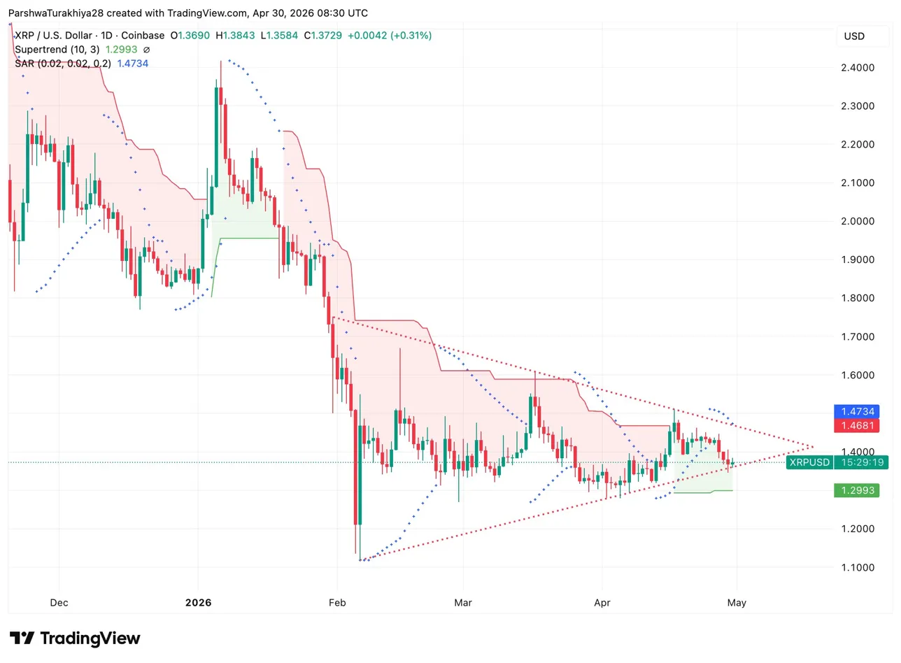 The $1.40 level remains the immediate battleground. XRP broke below it on April 28, recovered, and is now sitting just below it again. A clean daily close above $1.40 and then the SAR at $1.4734 is the sequence that matters for the first half of May.