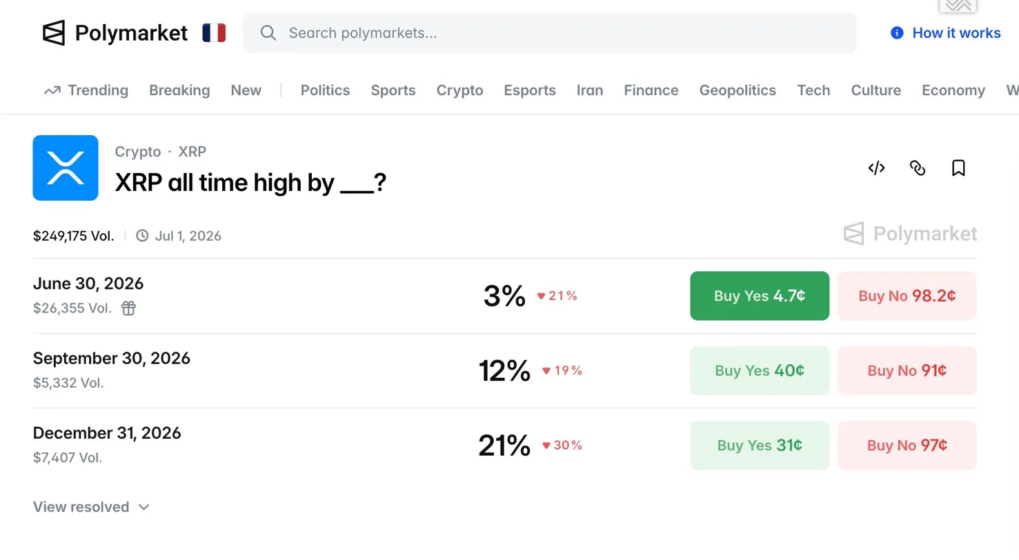 - Polymarket gives 3% odds of XRP hitting an ATH by June, 12% by September, and 21% by December 2026.