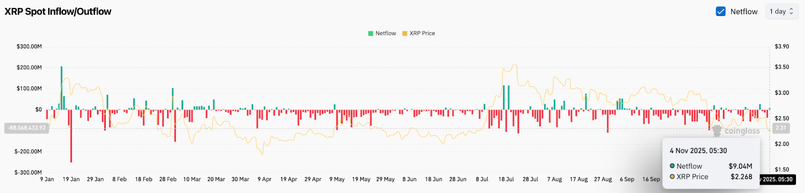 Spot flows tell the first part of the story. Despite attempts at recovery, XRP price update data from Coinglass shows only $9 million in net inflows on November 4. The inflow is modest compared to the steady red bars that dominated the last month as traders withdrew liquidity across exchanges.