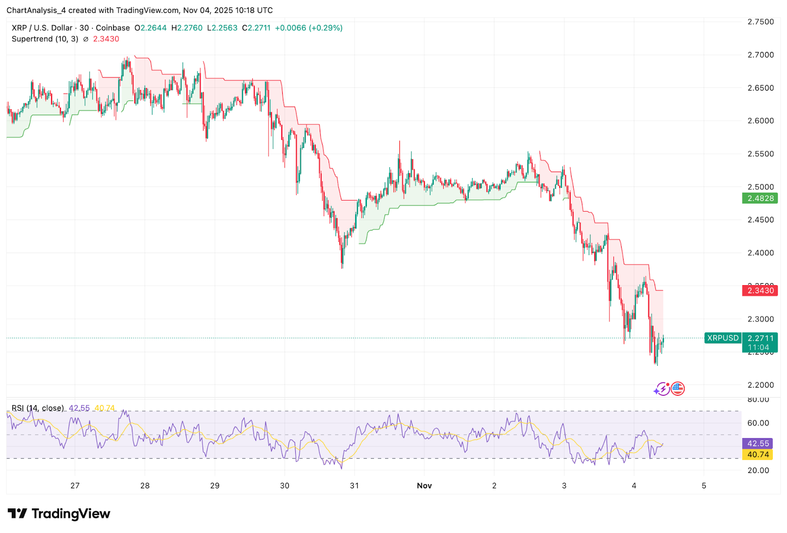 On the lower timeframe chart, XRP price action tried to bounce from $2.22, but the recovery stalled near the Supertrend resistance line at $2.34. RSI sits around 42, which confirms weakened momentum but not deep oversold conditions.