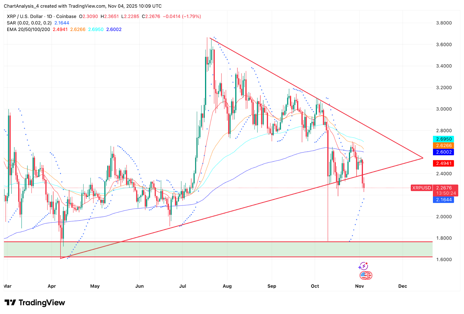 The daily chart shows the decisive shift. XRP price action has broken below the ascending trendline that has served as the backbone of every rally since April. Along with it, price has lost the EMA cluster sitting between $2.49 and $2.69, where the 20, 50, and 100 day EMAs converge. This EMA area now becomes resistance.