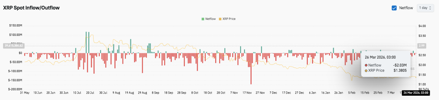 This decline suggests reduced leverage and lower speculative interest. Additionally, XRP spot flows show consistent outflows over time. These outflows indicate ongoing selling pressure and limited accumulation.