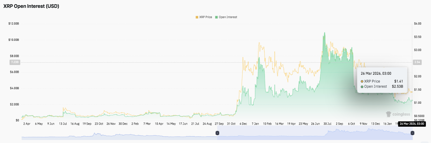 Open interest data further supports the cooling narrative. After peaking above $10 billion during a strong rally, open interest has dropped sharply. It now stabilizes near $2.5 billion.