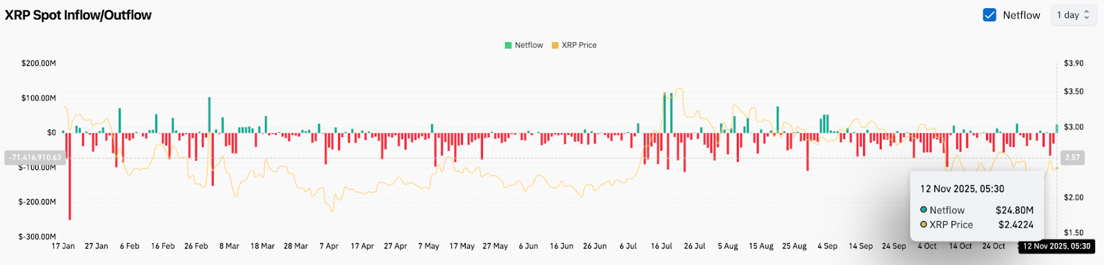 On-chain data from Coinglass shows $24.8 million in net inflows on November 12, marking a short-term shift from weeks of persistent outflows. This hints that traders are gradually moving XRP off exchanges, signaling a tilt toward accumulation.