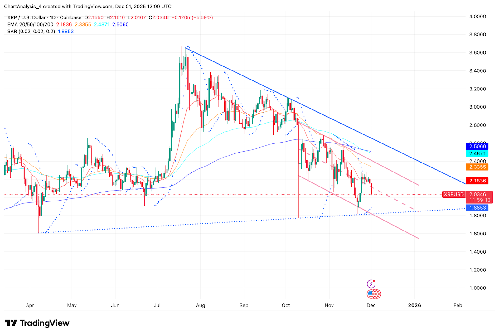 - Daily chart stays bearish with XRP locked below major EMAs and the dominant descending trendline.