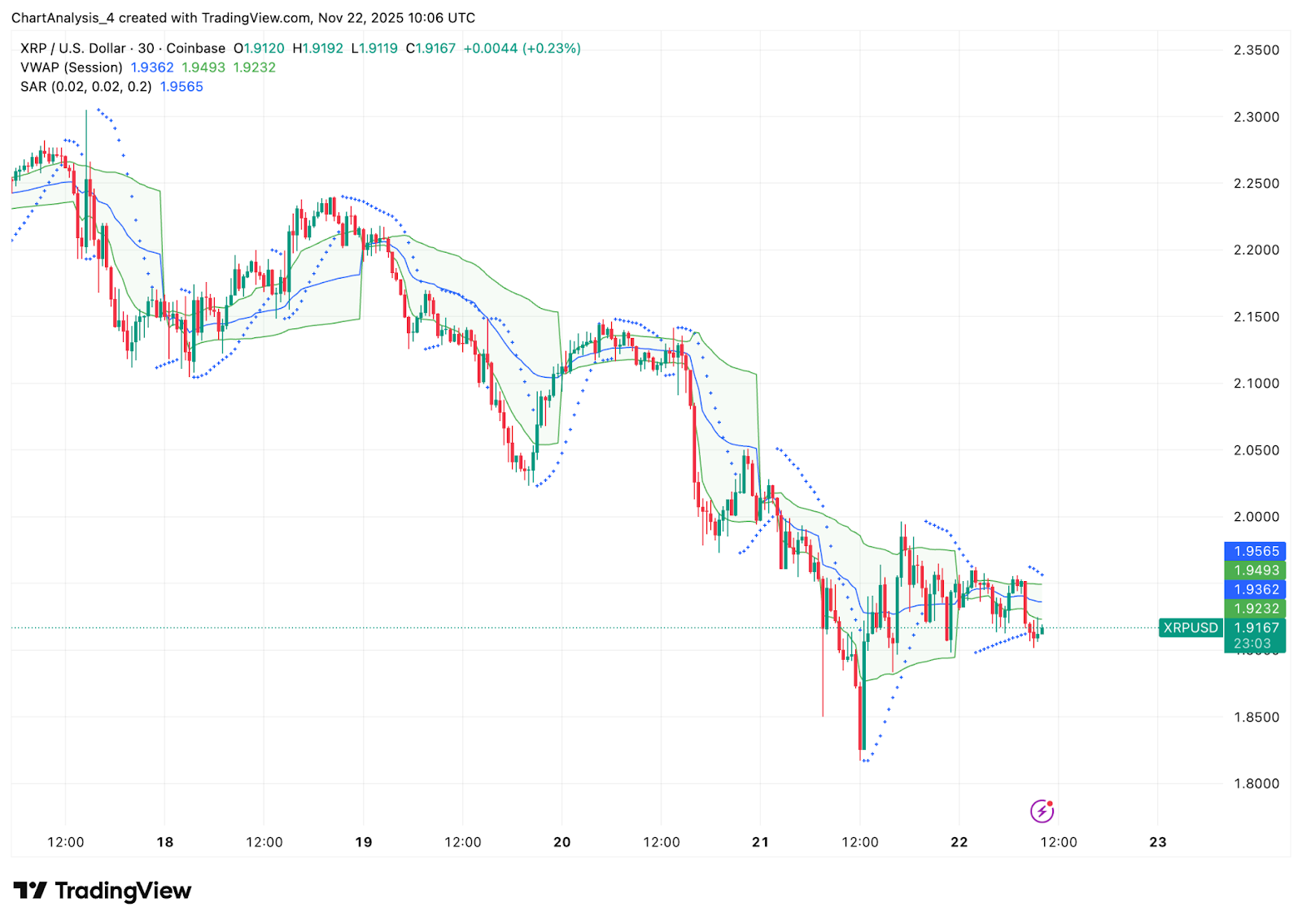 The 30-minute chart shows XRP trying to base near the $1.91 area. Parabolic SAR dots remain above the price, signaling that sellers are still in control. VWAP resistance at $1.94 caps intraday momentum, and attempts to push through it have failed repeatedly.