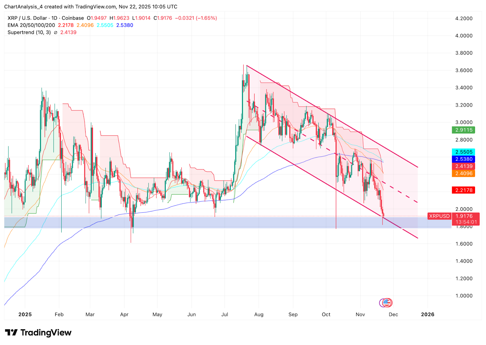 - XRP trades near $1.91 as the token hits the bottom of its multi-month descending channel and retests key support.