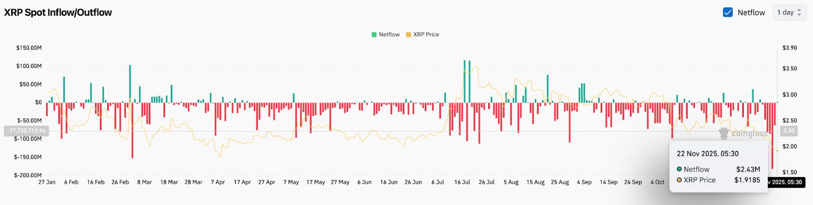 CoinGlass data shows another day of negative spot flows, with XRP recording roughly $2.4 million in outflows on November 22.