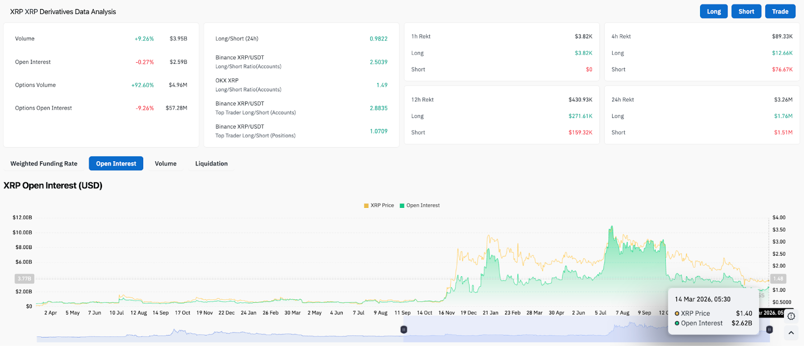 - Volume rises 9% to $3.95B while open interest dips slightly to $2.59B.