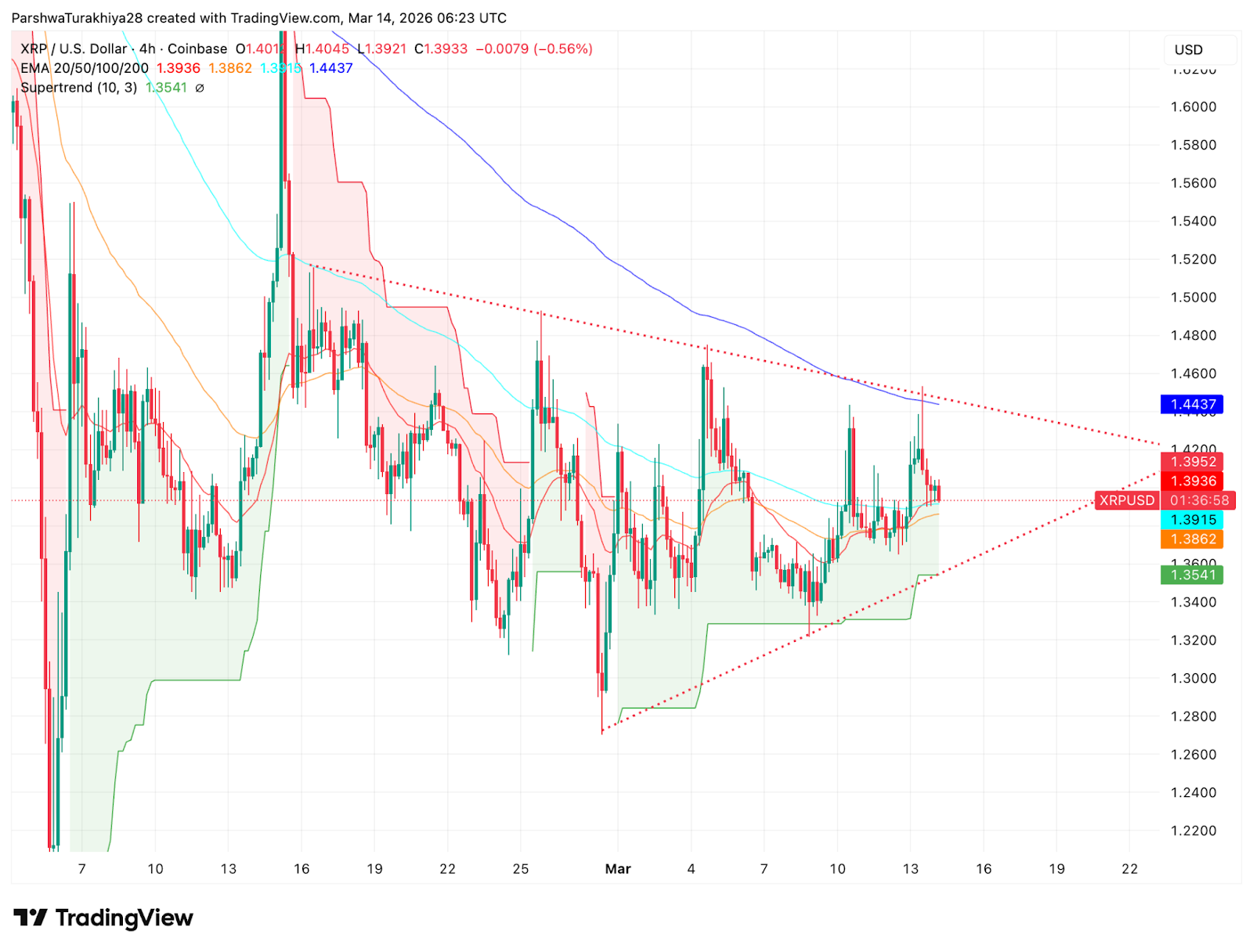 The 200-day EMA at $1.4438 is the level that matters most. XRP has not closed a 4-hour candle above it since mid-February. The triangle is compressing toward resolution, and whichever direction it breaks will likely be amplified by the EMA cluster sitting directly at the breakout zone.